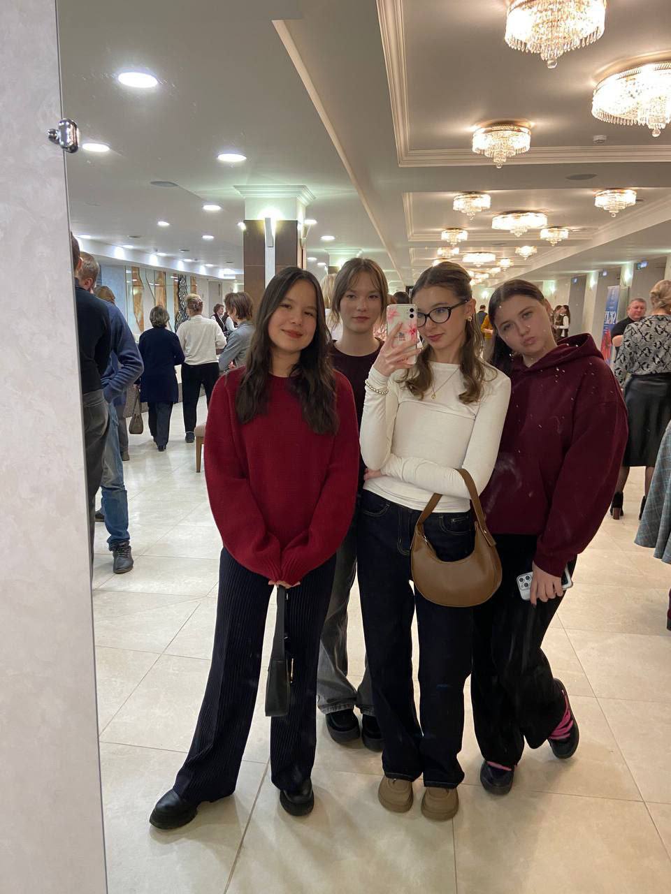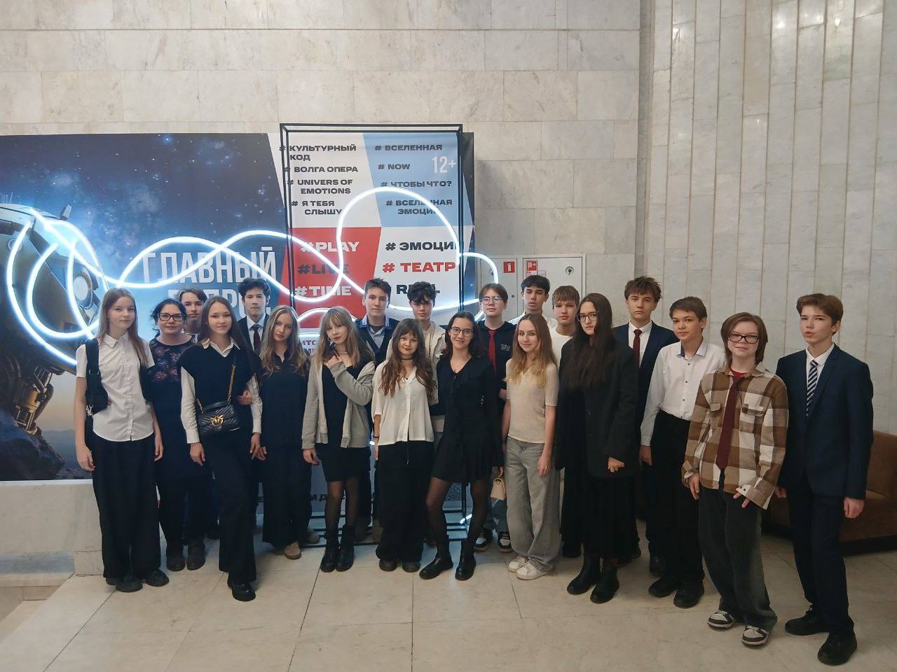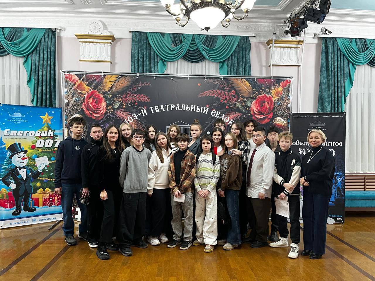7А класс в Русском драматическом театре После спектакля «История одной встречи». В осноу инсценировки легли произведения В. М. Шукшина: «Слово о малой родине», «Миль пардон, мадам!», «Жена мужа в Париж провожала», «Степка».